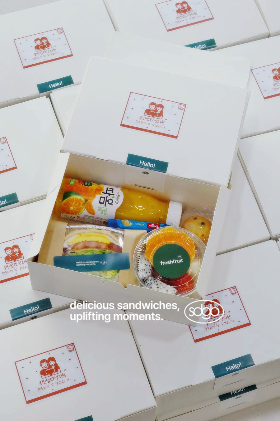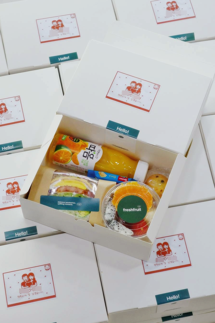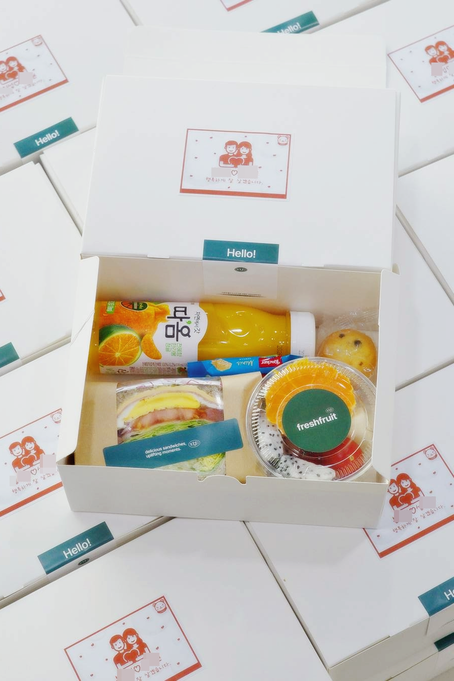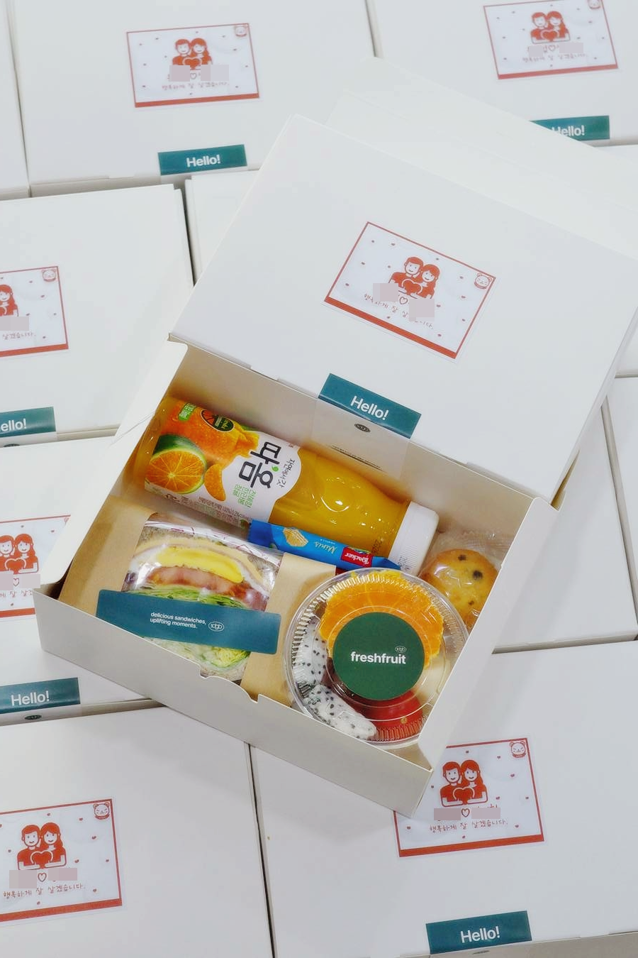 - "베이직샌드 1p + 과일컵 + 미니머핀 + 로아커 웨하스 + 따옴 과즙쥬스" 40 ea를 물티슈와 함께 준비했습니다.