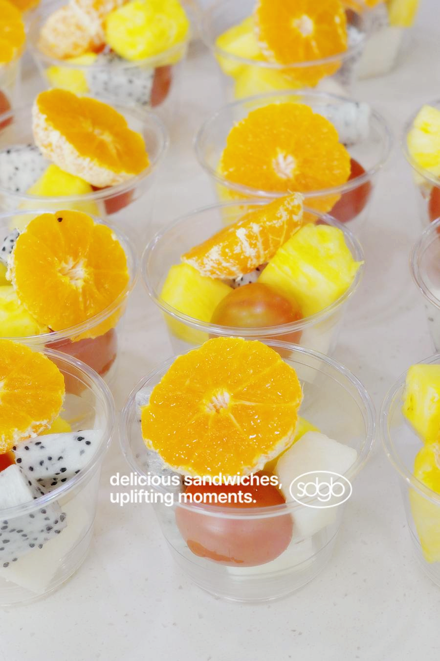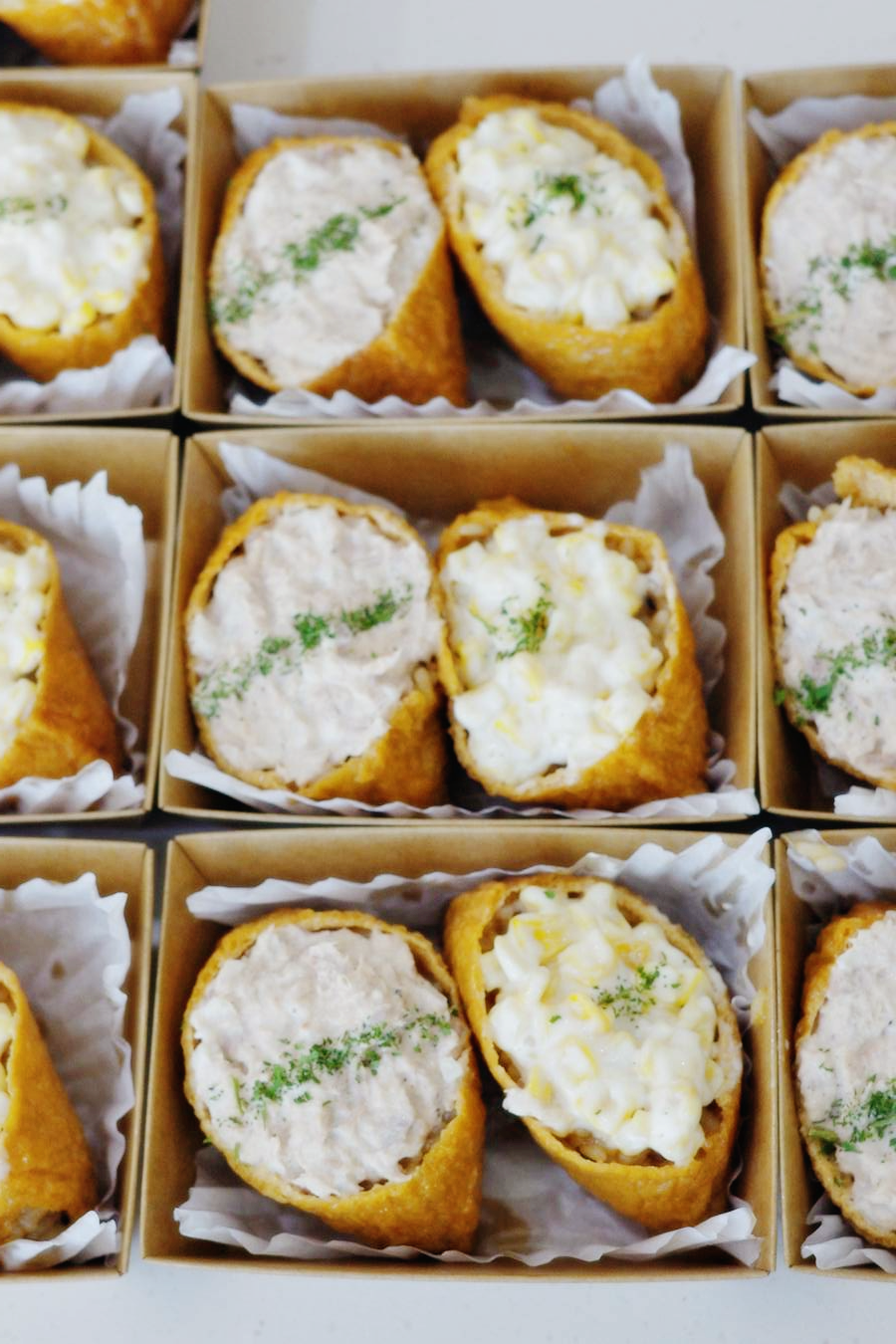 - "베이직샌드 1p + 토핑유부 2p: 참치마요, 콘마요 + 과일컵 + 버터쿠키" 14 ea를 물티슈와 함께 준비했습니다.