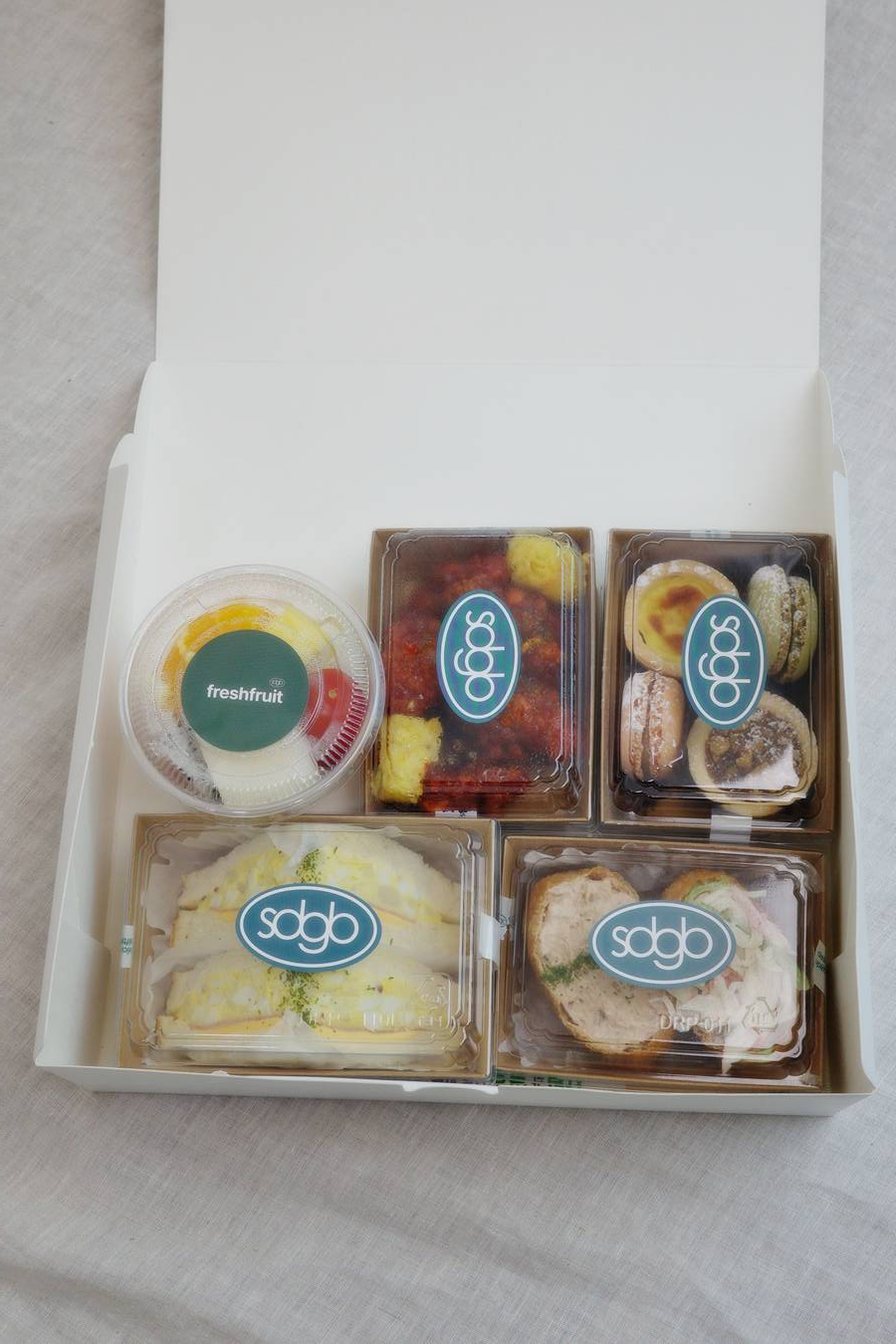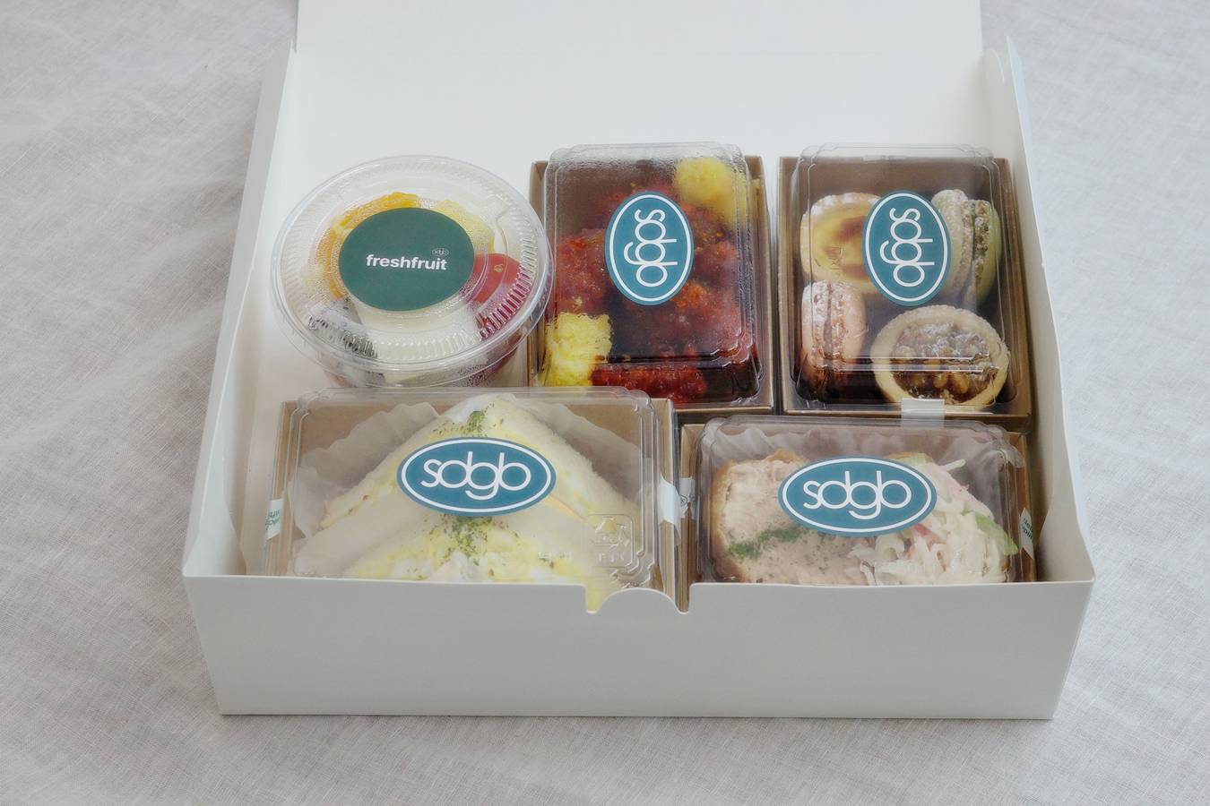 - "모닝샌드 2p + 토핑유부 2p: 참치마요, 게살오이 + 과일컵 + 닭갖얻 + 디저트박스"를 물티슈와 함께 한 상자에 준비했습니다✌️