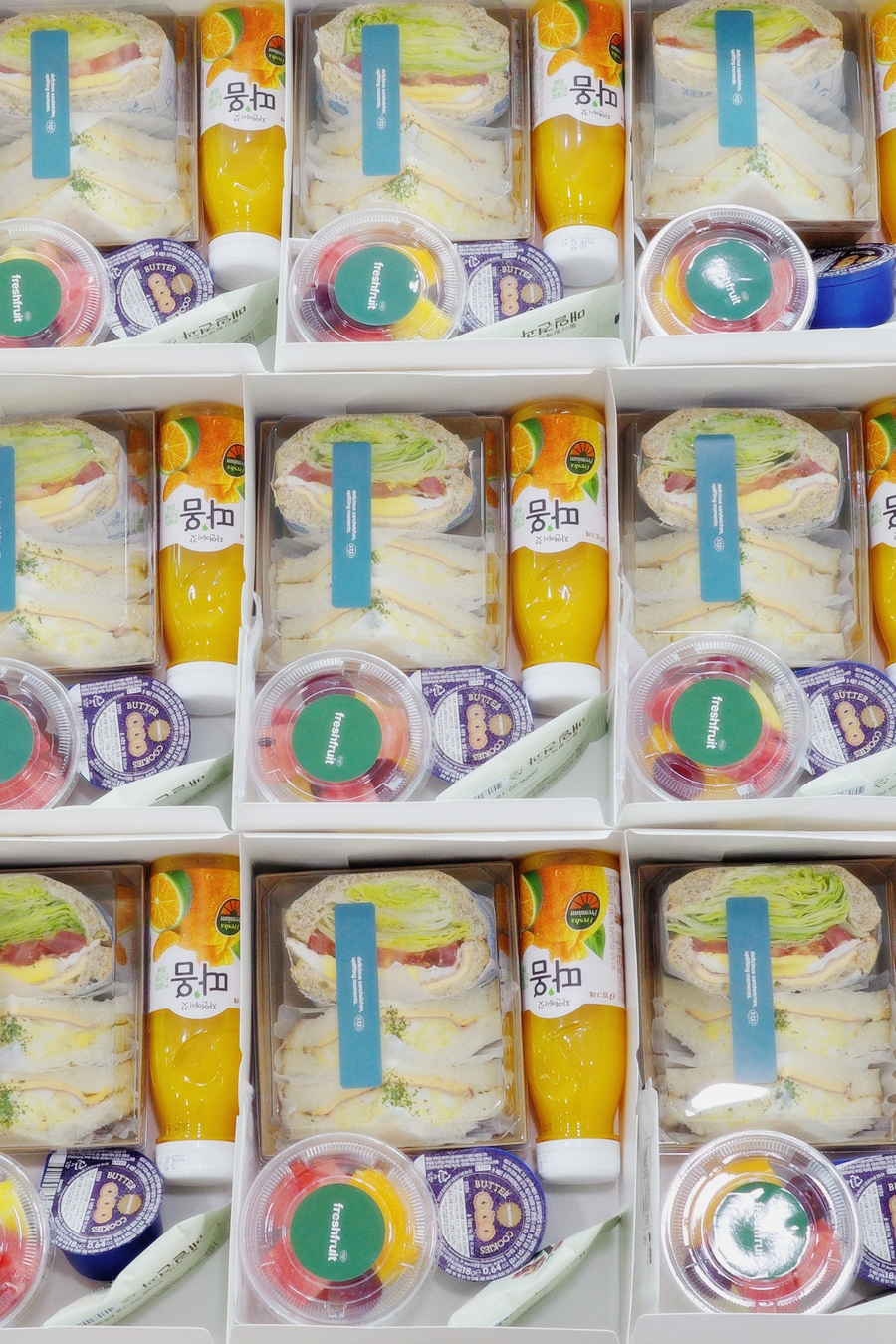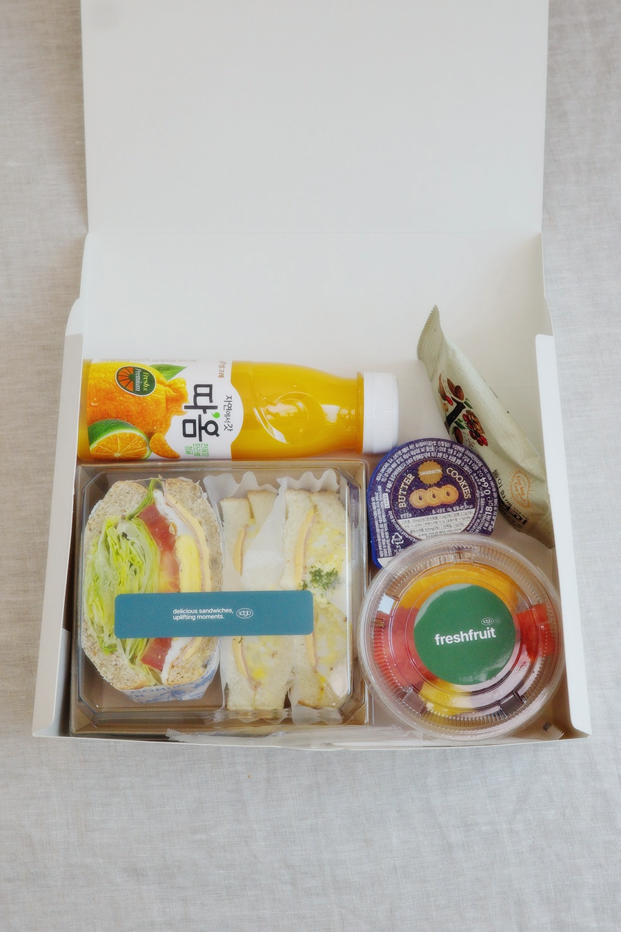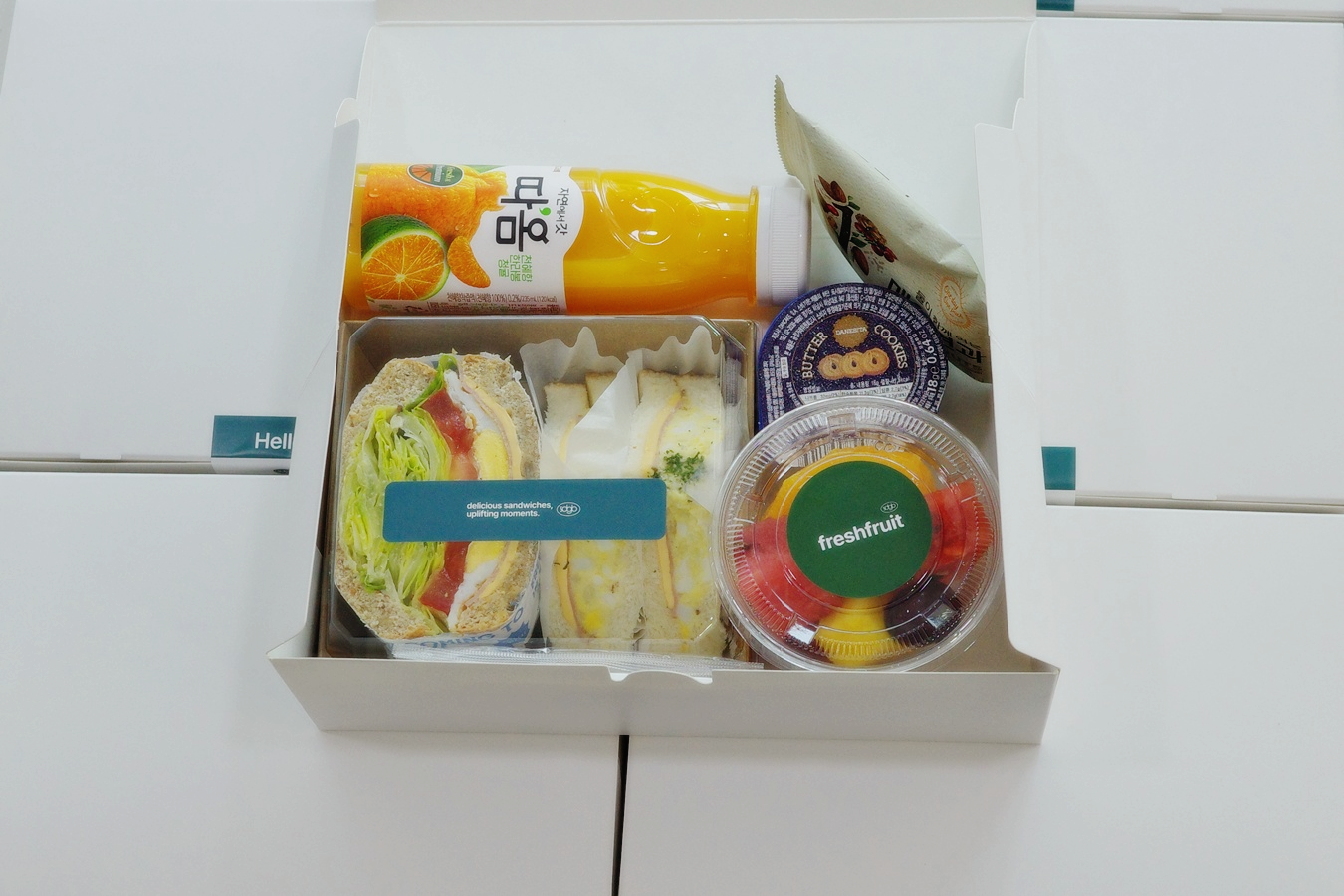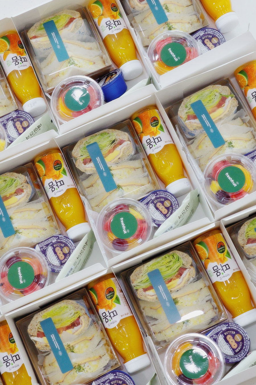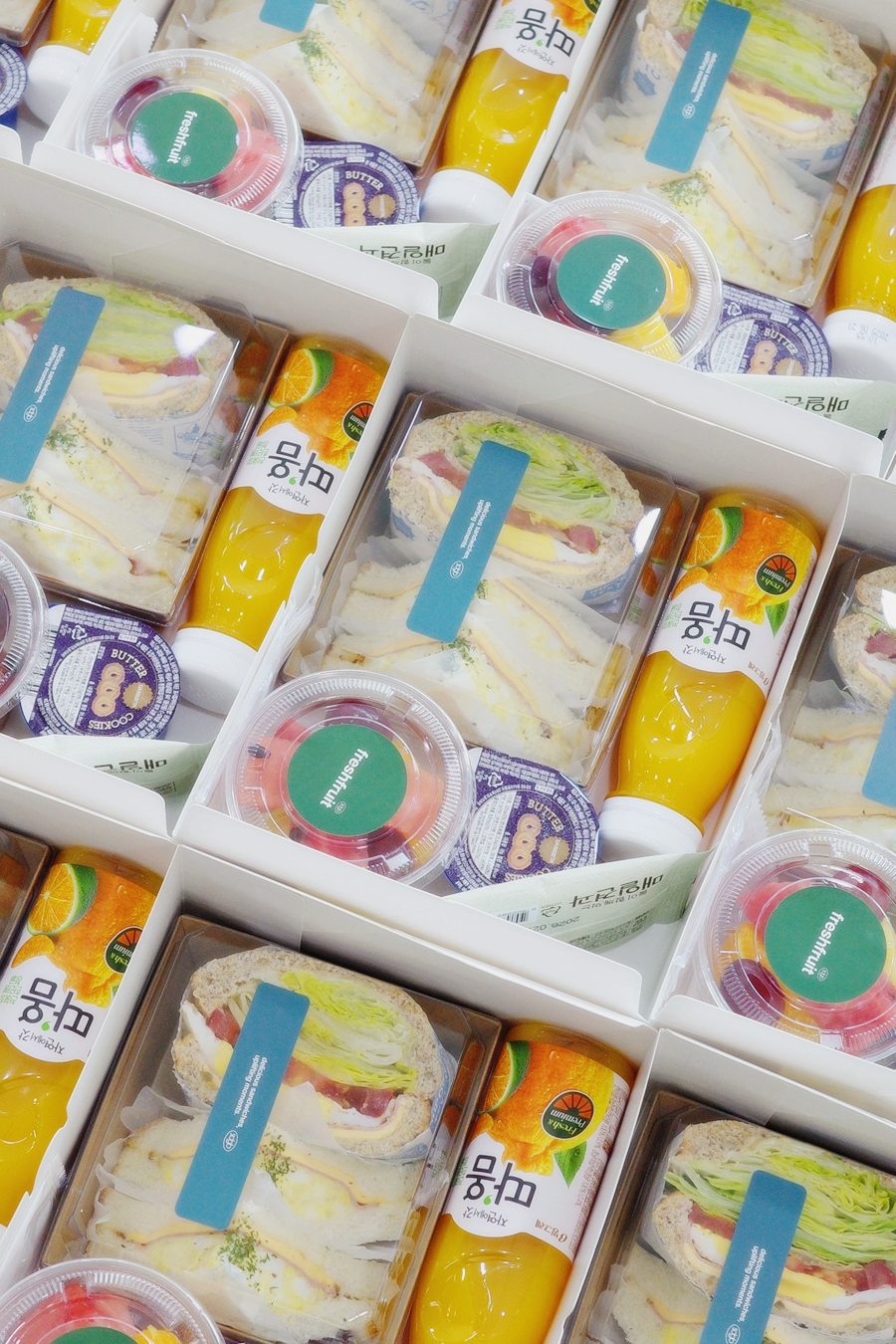 - "베이직샌드 1p + 모닝샌드 2p + 과일컵 + 매일견과 + 버터쿠키 + 따옴 과즙쥬스" 16ea 준비했습니다.