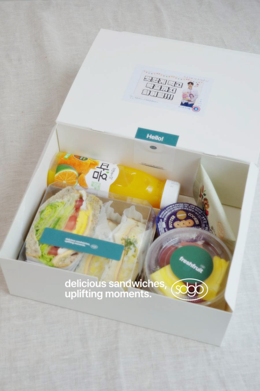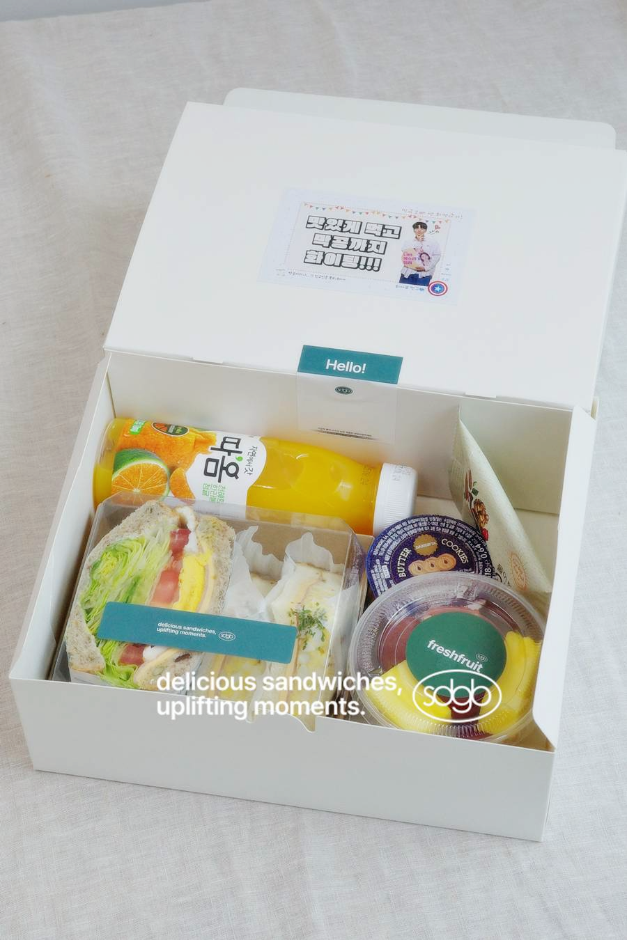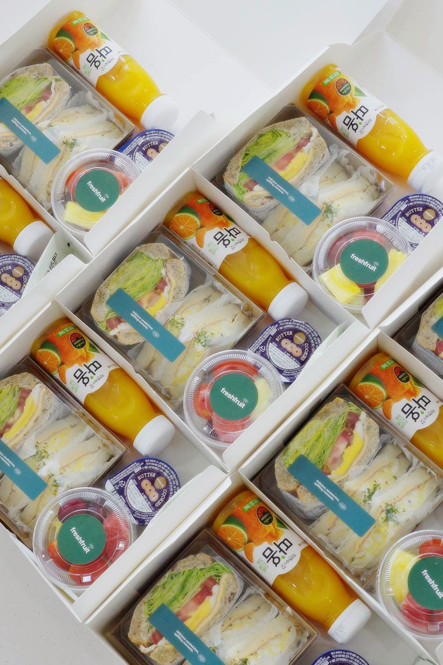 - "베이직샌드 1p + 모닝샌드 2p + 과일컵 + 매일견과 + 버터쿠키 + 따옴 과즙쥬스"를 물티슈와 함께 8 ea 준비했습니다.